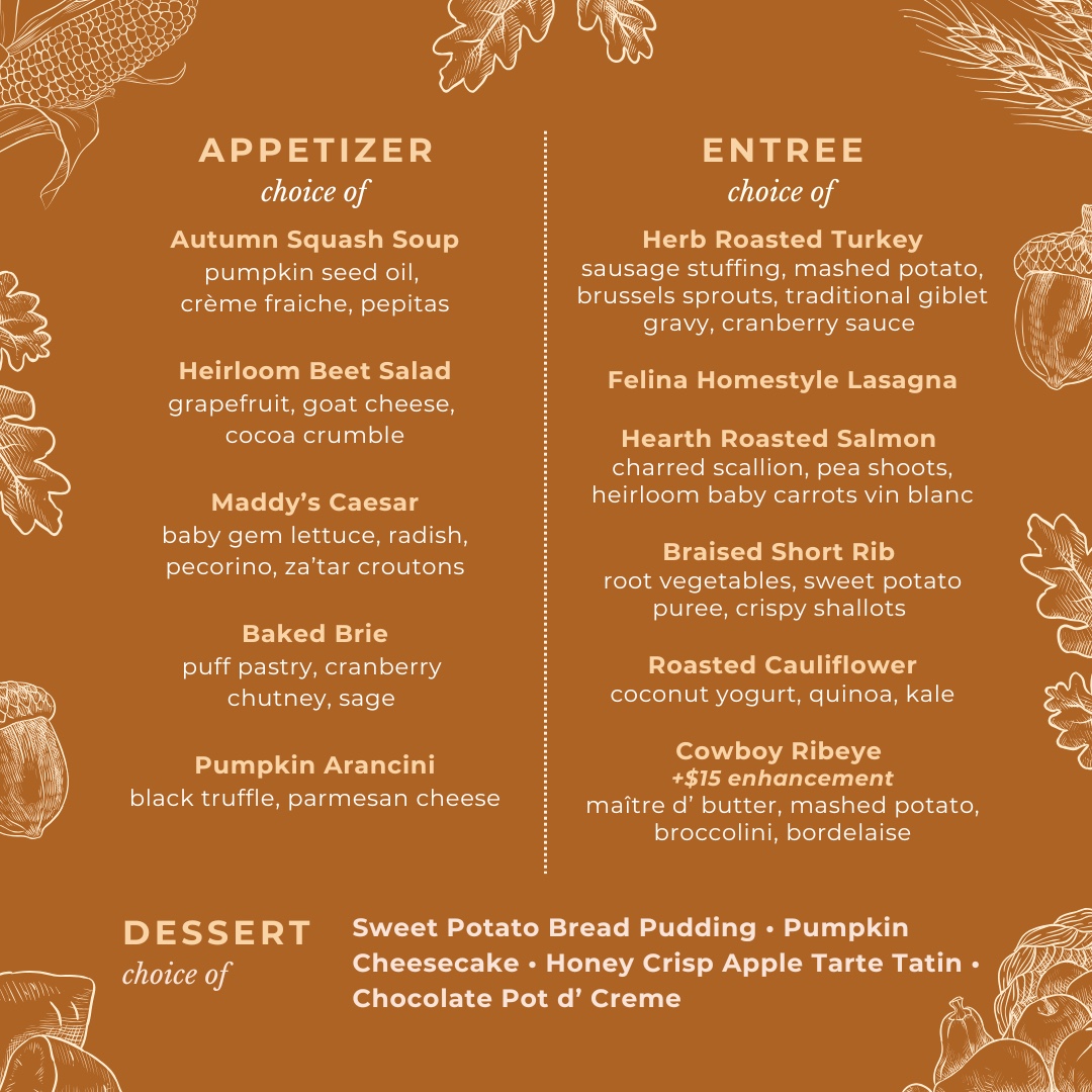 Maddalena’s is offering Thanksgiving sides and desserts this year (no turkeys). Sides include bread stuffing, old fashioned pan gravy, fresh whole cranberry sauce, buttered sweet corn, glazed baby carrots, mashed potatoes, sweet potato casserole topped/pecans, home-made sweet dinner rolls, green bean casserole and lo-salt pan gravy. Desserts offered are Maddalena’s Pumpkin Vanilla Cheesecake and Maddalena’s Famous Apple Crumb Pie. Orders must be placed by November 6.