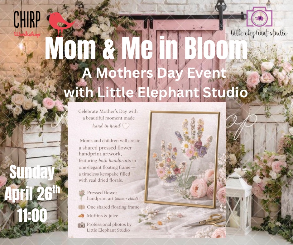 Join Chirp Workshop for Mom & Me in Bloom, a special Mother’s Day experience where moms and children create a shared pressed flower handprint keepsake — two hands, one frame, forever captured in florals. Mom and child will head upstairs to Little Elephant Studio where Jess will capture the best mommy and me photos! Photos will be emailed up to 2 weeks after day of event.